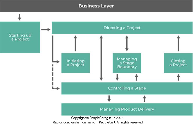 PRINCE2’s process lifecycle includes seven processes guided by its principles. Each process includes a sequence of activities and recommended actions that integrate PRINCE2’s people and practices elements.